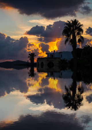 reflection of a palm silhouette under a cloudy sky at sunset in Sardinia