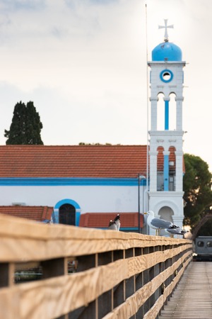 Bell tower of Saint Nicholas monastery in Porto Lagos, Xanthi, Greece. Seagulls standing on the wooden fence.