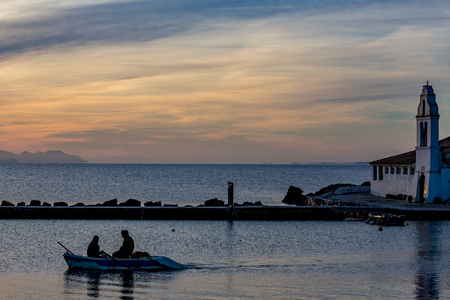 Fishermen Silhouettes in small fishing motor boat near orthodox church of Vlaherna at dawn, dramatic sky near Corfu, Kerkyra island, Greece, early spring morning