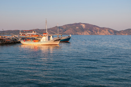 Boats at Agios Sostis port at sunset, Zakynthos, Greece