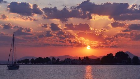 Impressive sunset view of Vlacherna Monastery. Colorful evening cityscape of Kerkira town, capital of Corfu island, Greece, Europe. Great spring seascape of Ionian Sea. Traveling concept background.