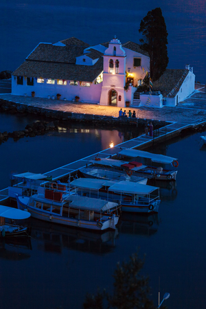 Illuminated night scene of Vlacherna monastery and Pontikonisi island, Kanoni, Corfu