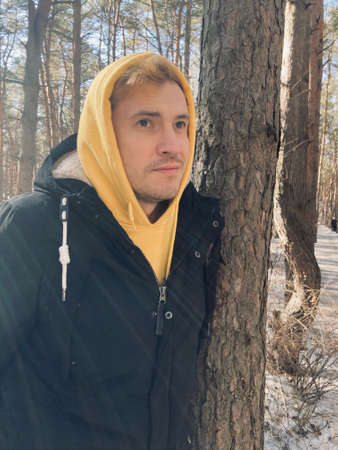 Portrait of young man on walk in forest. Handsome guy in yellow hoodie and black jacket poses, leaning on tree in early spring