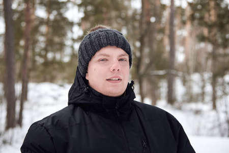 Portrait of a young man in a hat and jacket in the winter forest.