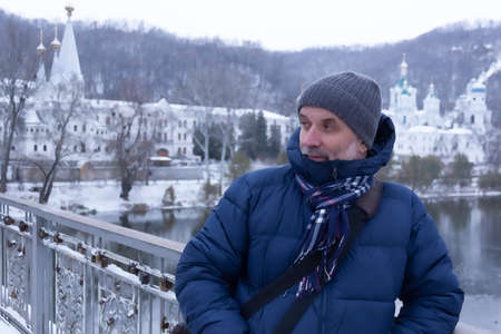 A mature man with a beard stands on the bridge in winter and looks away. Behind the river and the church of the Sviatohirsk Lavra