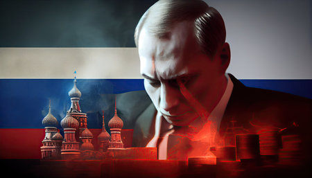 Man with Russian flag blindfold on black background, Russian propaganda closed peoples eyes concept.