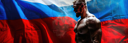 Athletic man with muscular body standing against russian flag