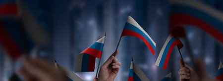 Russia flags in their hands on a blurred urban background. The photo illustration was created without the use of artificial intelligence, only using Photoshop.