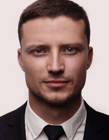 Portrait of businessman in suit against gray background