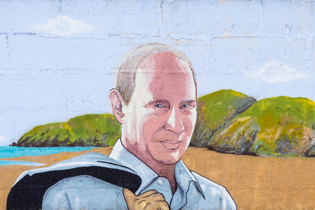 RUSSIA, CRIMEA, SUDAK, SUNNY VALLEY - MARCH, 03 2017: Graffiti on which the president of Russia Putin. In the background is the landscape of the Crimea.