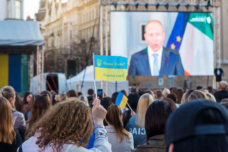 Prague, Czech Republic, March 2022: Stand with Ukraine. Protest against the war in Ukraine and russian armed aggressive. Global military conflict, invasion.