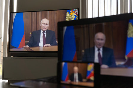 Watching Vladimir Putin on TV. President of Rusia Vladimir Putin declares war to Ukraine