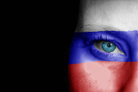 A young female with the flag of Russia painted on her face on her way to a sporting event to show her support.