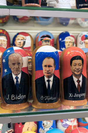 Moscow, Russia - February 28, 2022: Putin, Biden and Xi Jinping in the form of Russian nesting dolls in a gift shop in Moscow. Relations between Russia, USA and China