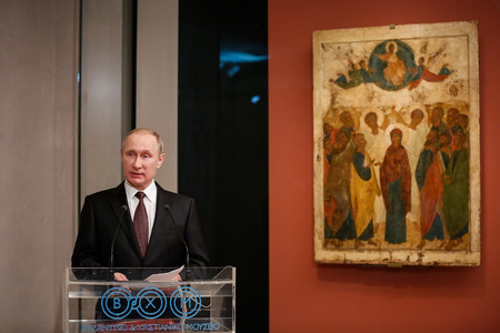 Athens, Greece - May 27, 2016: Russian President Vladimir Putin delivers a speech during his visit at the Byzantine and Christian museum in Athens