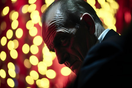Close-up profile of a businessman with receding hairline and beard, wearing a suit and tie, looking away from the camera against a dark background, conveying seriousness and professionalism