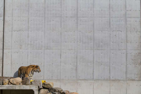 Tiger, a Bengal Tiger playing in a zoo with very high large concrete wall