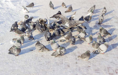 Lonely crow among a flock of the street pigeons sitting on the city square, covered with snow and rime during a severe frost