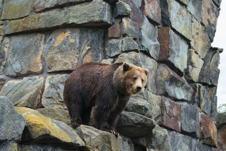 Brown bear sitting on a rock. Wildlife environment. Animal background