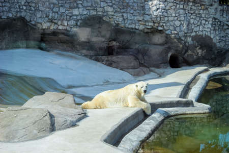Two raised Brown Bear sleep on the concrete ground in animal area at Noboribetsu Bear Park in Hokkaido, Japan.