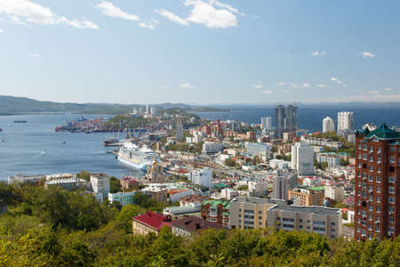 Panorama of the central part of the city of Vladivostok from the highest point of the Eagle's Nest hill.