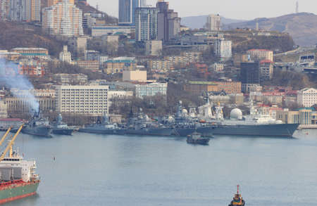 Vladivostok, Russia - April, 10, 2019: The cruiser Varyag and other warships of the Pacific Fleet of Russia at the pier in the port in the center of Vladivostok.