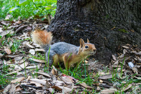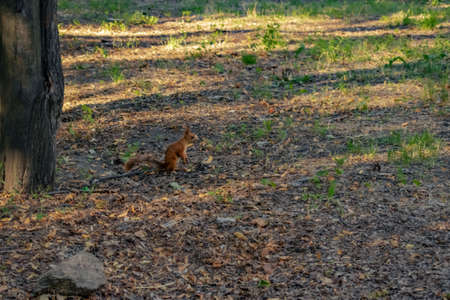 Red squirrel stands on the ground in the autumn Shevchenko park in Dnipro (Ukraine). Cheerful cute rodent on the floor among yellow leaves and green grass
