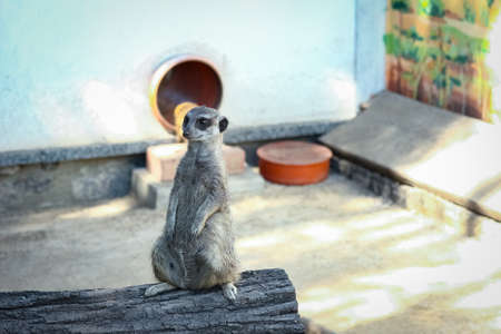 Gopher is standing on its hind legs on the meadow and looks at the camera. full length.