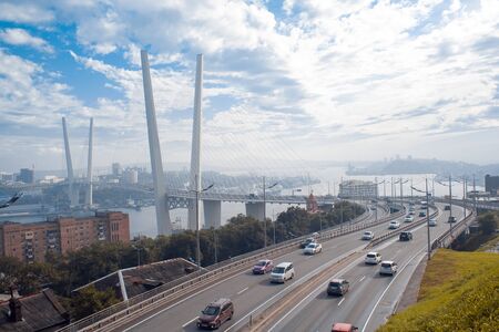 Vladivostok, Russia-September 19, 2021: Urban landscape with a view of the Golden Bridge