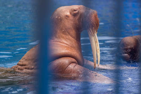 Tiger in a cage at the zoo. The tiger is a predator. A beautiful tiger