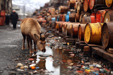 A solitary deer grazes at a polluted riverbank, surrounded by colorful industrial barrels, highlighting the contrast between nature and environmental degradation.