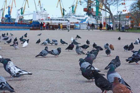 Photo of pigeons on the background of the embankment of Feodosia, the park and the port. People are walking along the embankment.