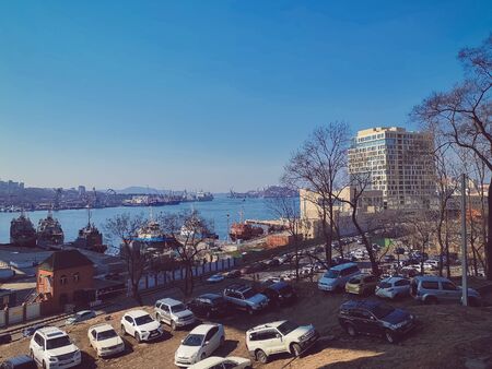 Panoramic views of sea harbour sea Vladivostok, Russia.