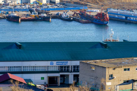 Vladivostok, Russia - November 27, 2021: Industrial landscape with a view of the Diomidovsky port and ships.
