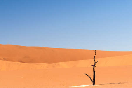 Abstract dead Camelthorn trees against orange sand dunes and blue sky in Deadvlei, Sossusvlei, Namib-Naukluft National Park. Famous travel destination in Namibia, Africa.
