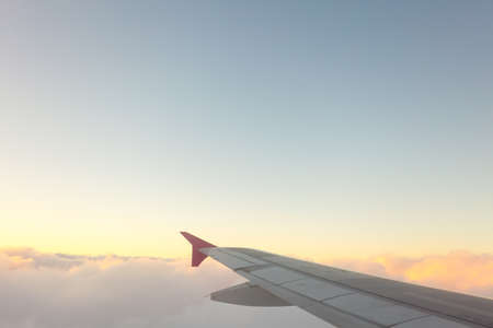 Wing of an airplane flying above the clouds at sunset. Travel concept