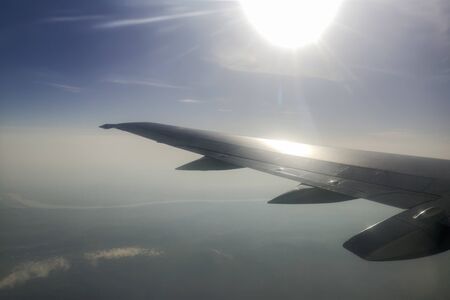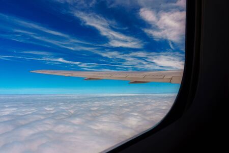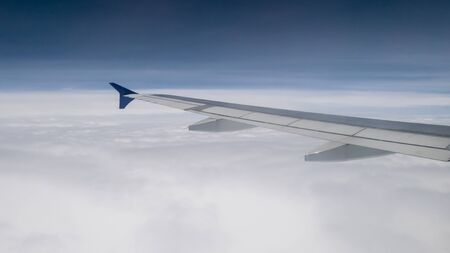 Adventure, travel, transport concept. View from plane window at sky with clouds and wing