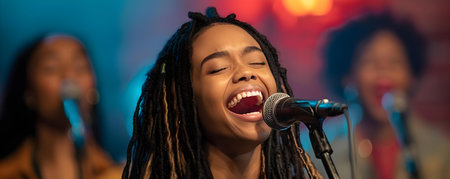 Young woman with dreadlocks singing with passion into a microphone on stage