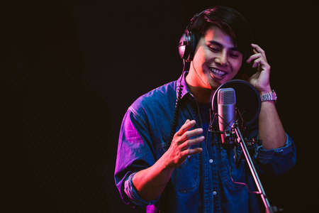 Asian male singer recording songs by using a studio microphone and pop shield on mic with passion in a music recording studio. Performance and show in the music business. Focus on male face