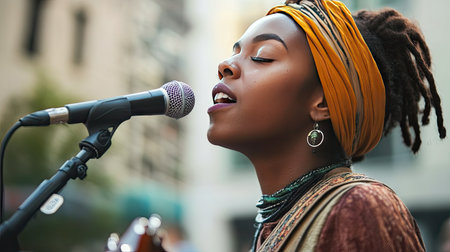 Captivating afro female singer delivering energetic performance on stage with microphone