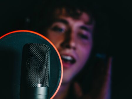 Handsome man recording a song. Focused on the microphone. Space for your text.