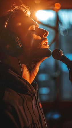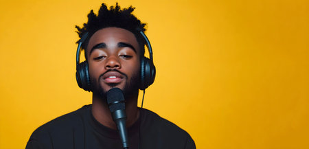 Young male vocalist with headphones is passionately singing into a microphone, set against a bright yellow backdrop, creating an energetic and artistic vibe