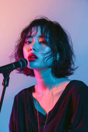 Stylish Female Singer Performing on Stage with Retro Microphone Under Neon Lights AI Generative