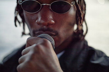 Portrait of young adult Black man wearing sunglasses holding microphone close to mouth performing or speaking outdoors, face partially in shadow, looking into camera