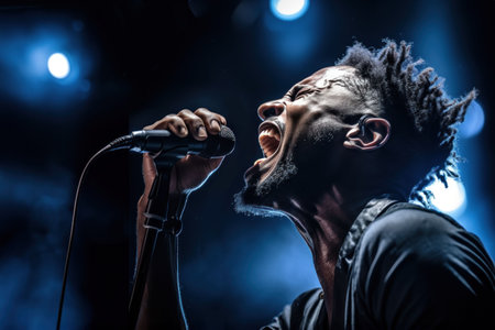 Rock band vocalist screaming while holding microphone on blurred background