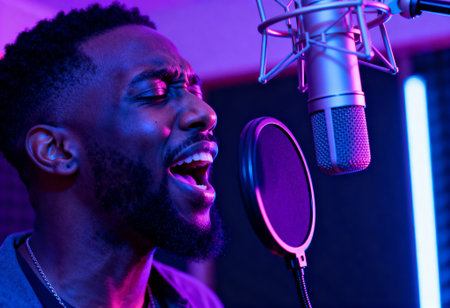 Expressive young man singing passionately into a professional microphone in recording studio with vibrant neon lighting ambiance.