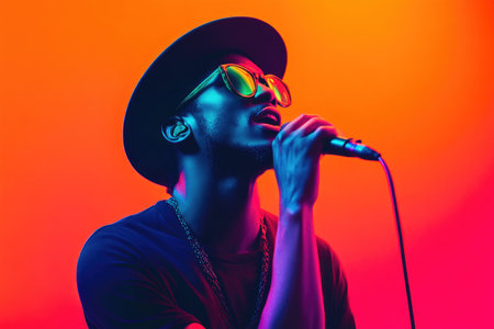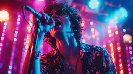 A vibrant image of a man passionately singing into a microphone. The colorful background and expressive pose capture the energy and emotion of a live performance, highlighting the artistry of music.