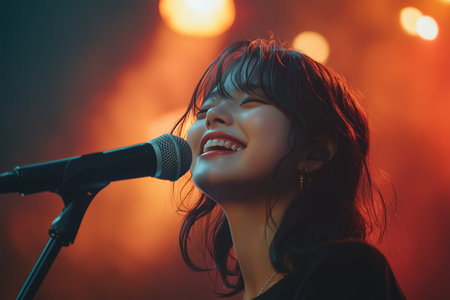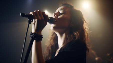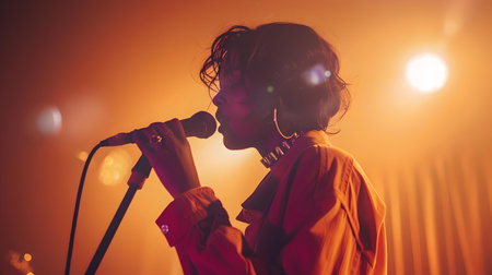 Moody concert scene with a female vocalist passionately singing into a microphone, backlit by warm stage lights. A.I.
