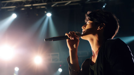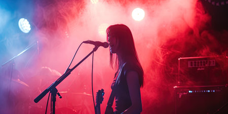 Silhouette of young female singer passionately performing live on stage with colorful lights and microphone, creating a vibrant and energetic atmosphere