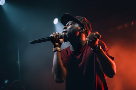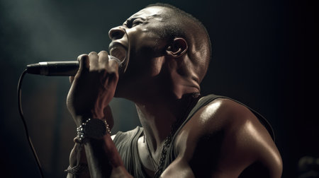 African rapper on stage rap, dynamic pose, hero angle, AI generative illustration